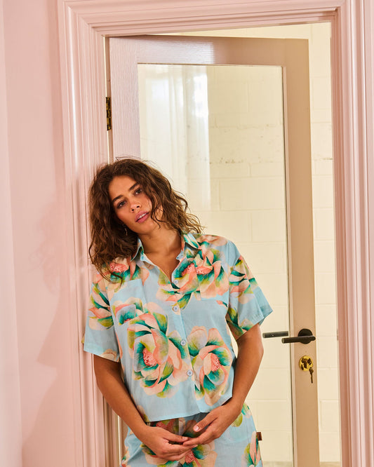 Big Beauty Floral Blue Adult Organic Cotton Short Sleeve Shirt & Short Pyjama Set