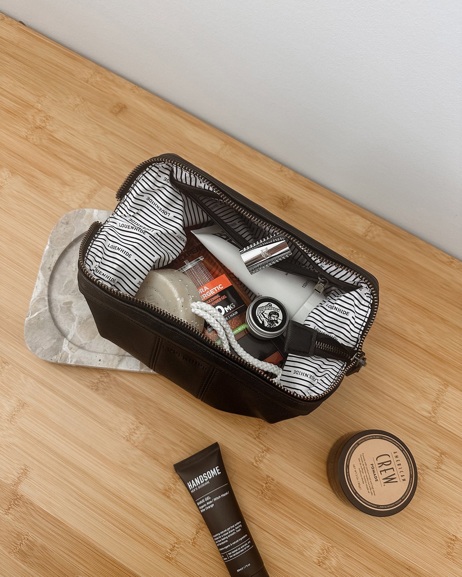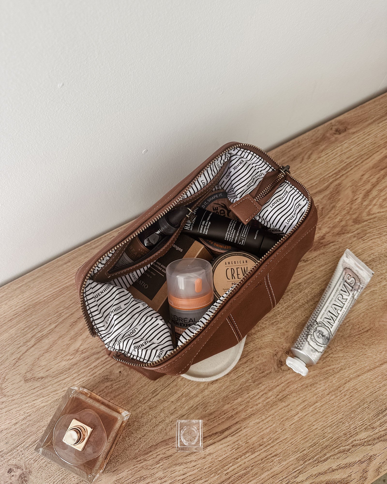 The Albie Saddle Cosmetic Case is a refined wash bag designed for effortless organisation and everyday practicality. Crafted from smooth vegan leather and finished with antique gold hardware, this cosmetic case offers a sleek, modern look suited to any routine. Inside, a practical zip pocket keeps smaller items neatly contained, while a secure zip closure ensures everything stays in place. With its considered design and durable construction, Albie Saddle stands confidently among the best unisex toiletry bags.