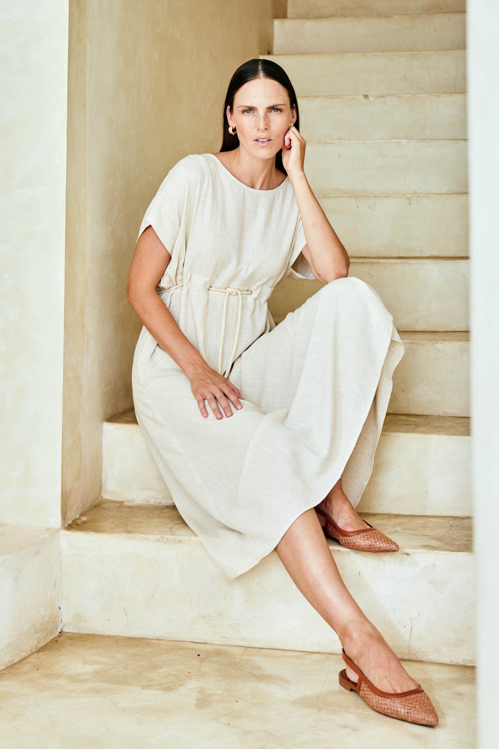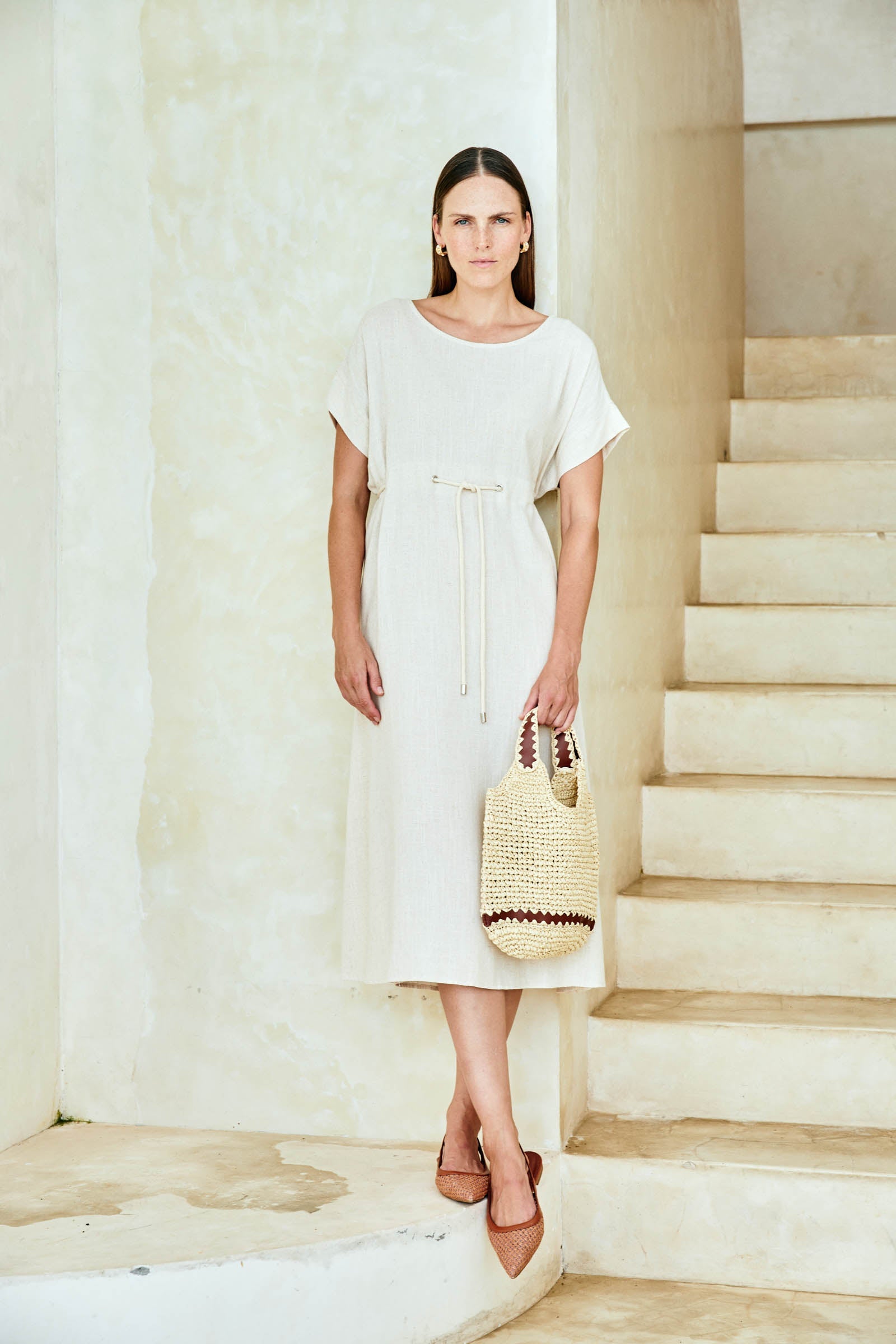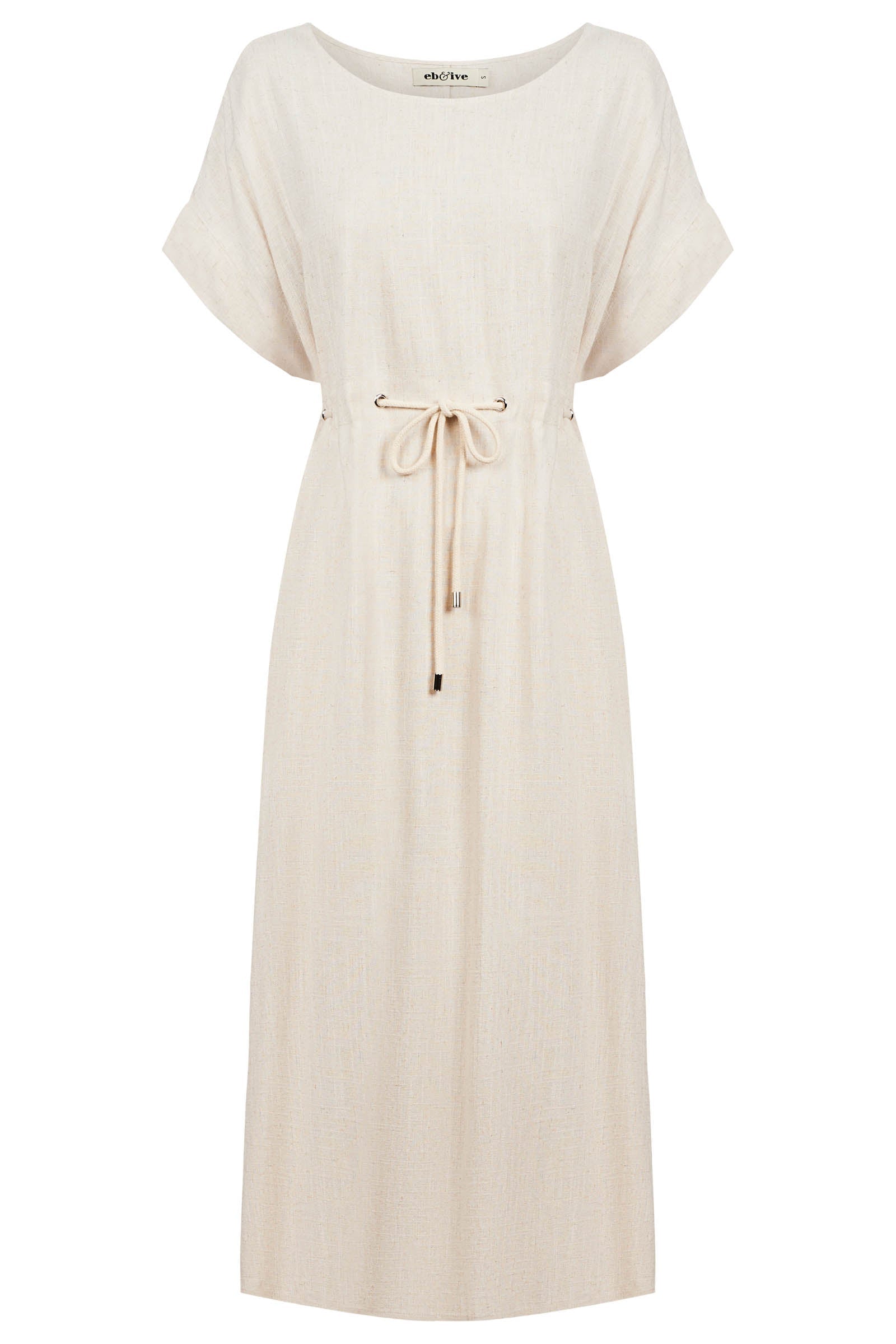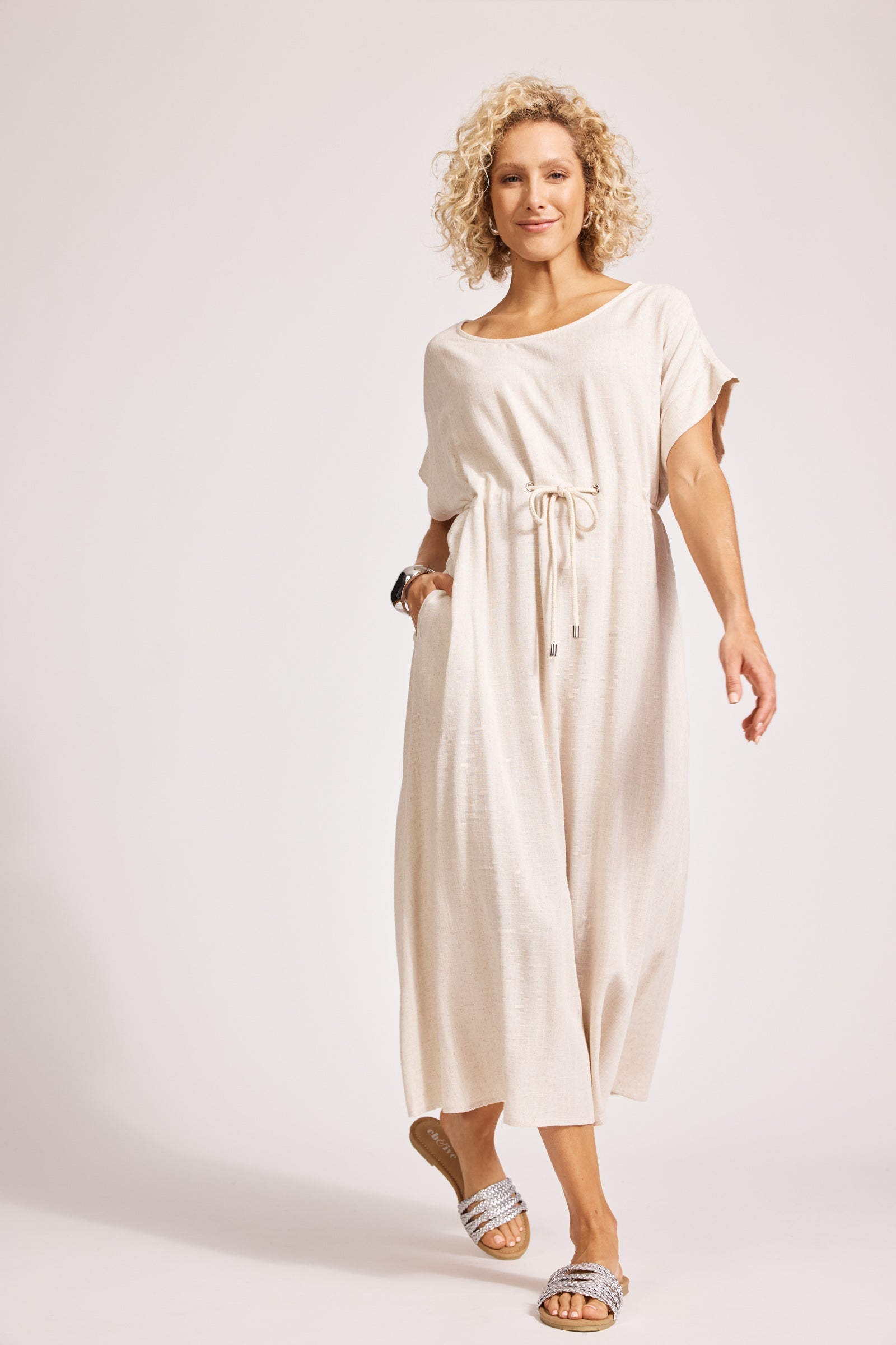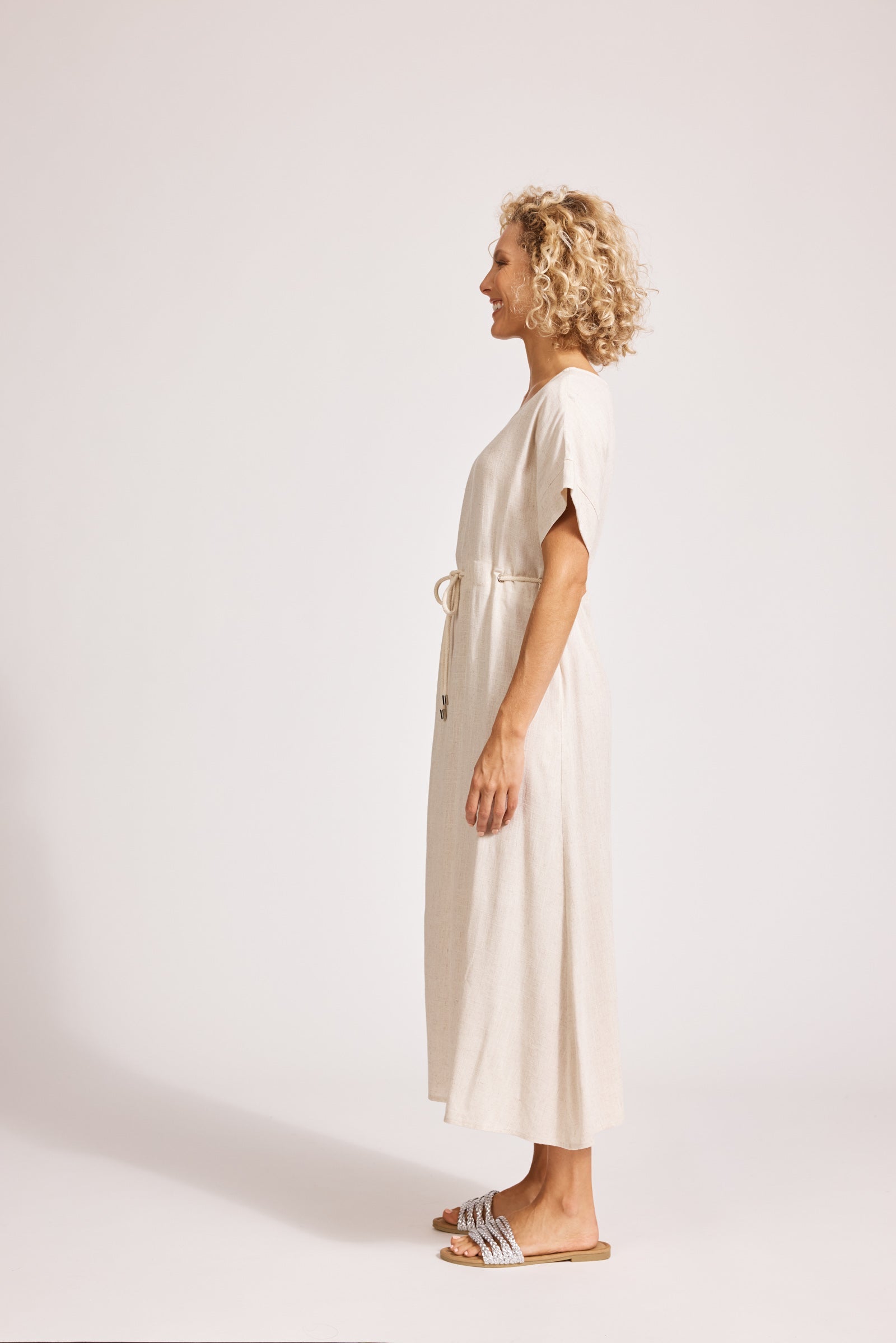 A relaxed midi dress with defined waist detail. Crafted from a soft linen-cotton blend. Features a round neckline, self-coloured cotton rope threaded through waist, A-line shape and functional side pockets.