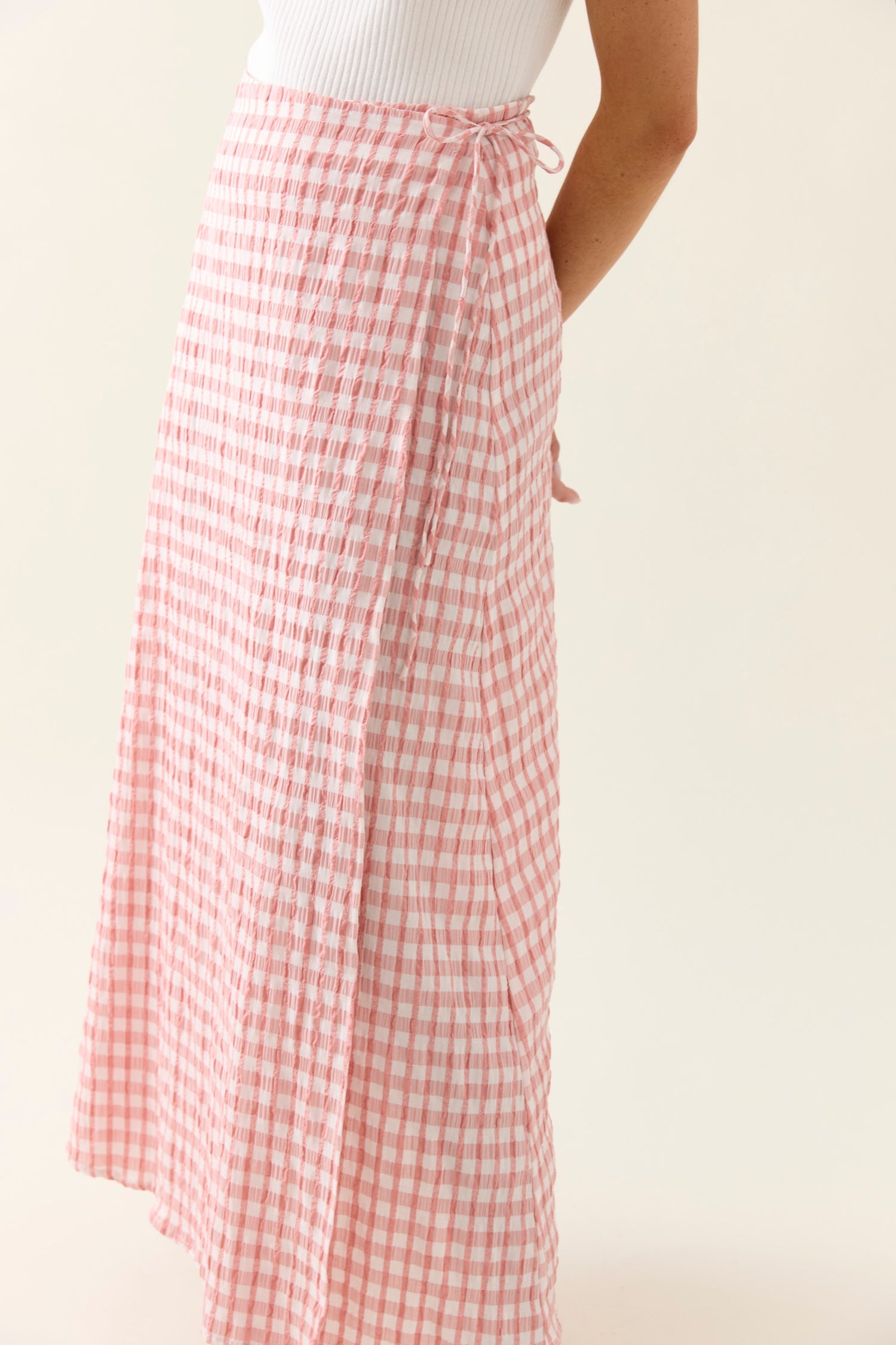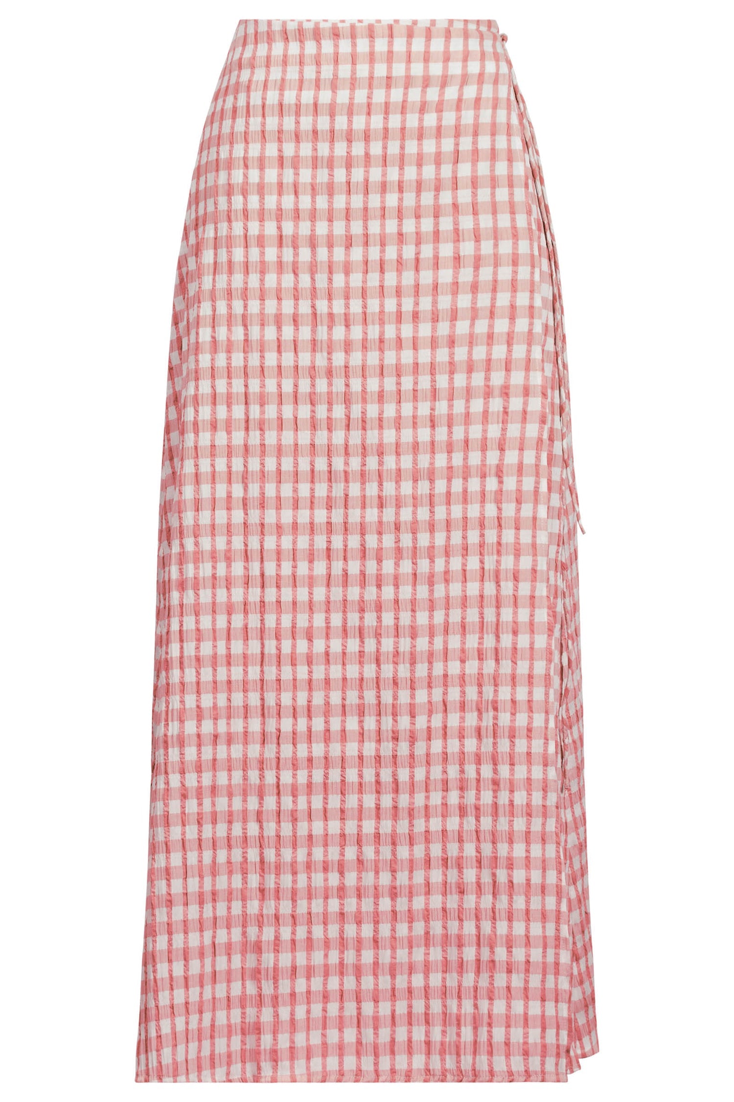 Designed in crisp gingham seersucker, this wrap skirt brings ease and style to summer dressing. Featuring a side tie fastening, small back belt loop and an A-line silhouette that skims the body gracefully.