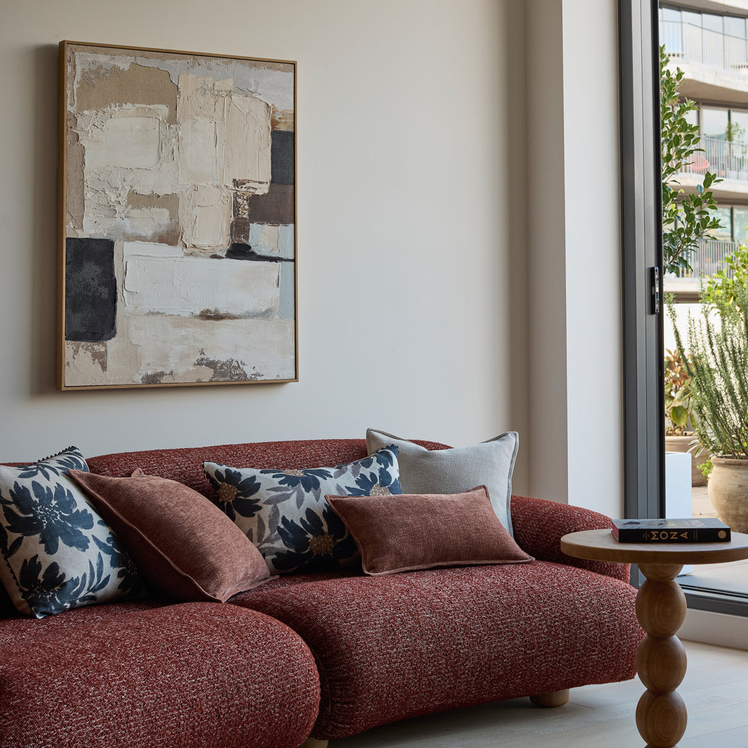 Hand-painted black floral printed on a natural background with natural reverse and black ric rac trim.