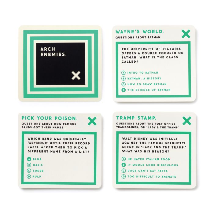 Includes 200 unique trivia questions to test your random pointless knowledge (to say the least).