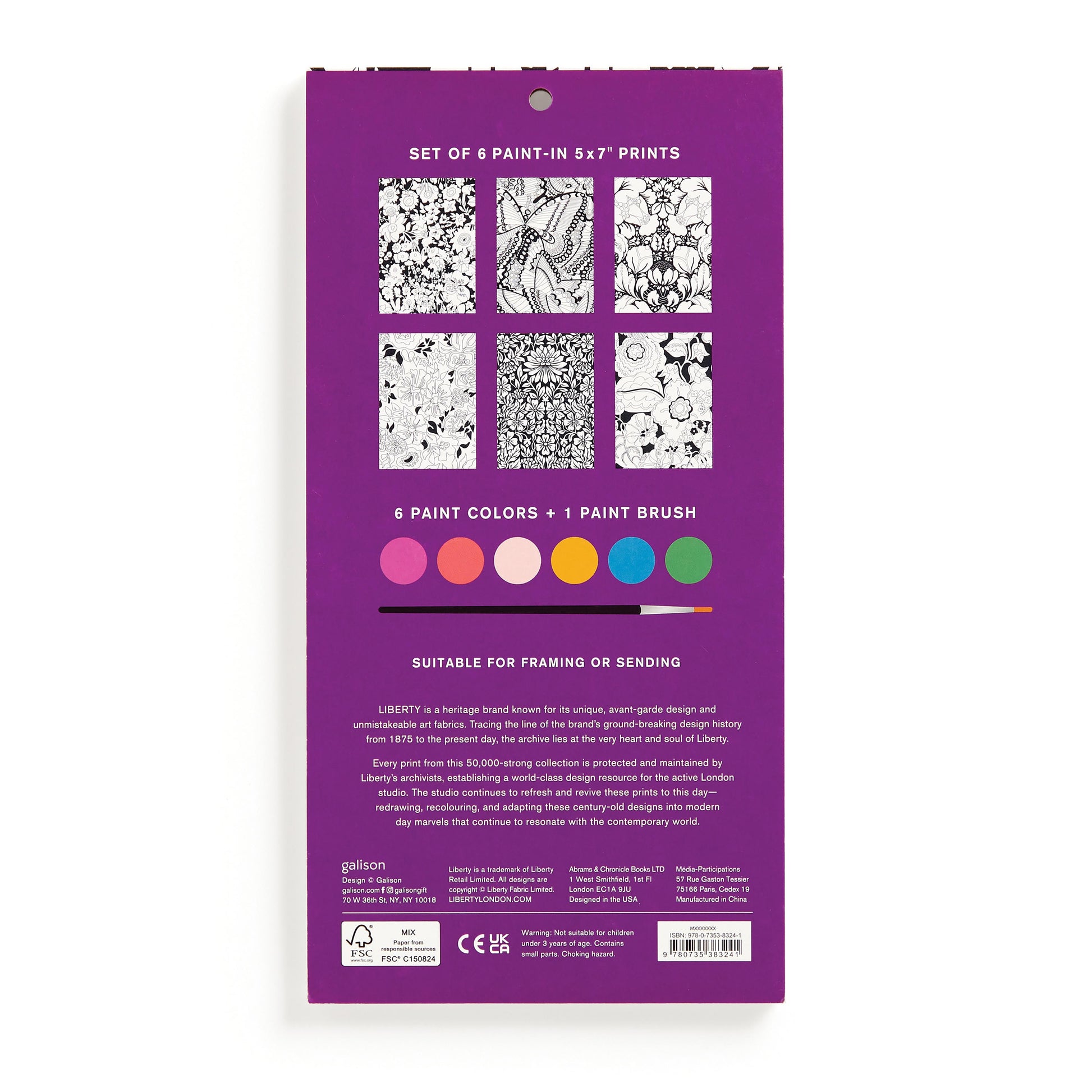 The Liberty Paint In Card Set includes a set of 6 cards featuring the iconic floral designs of Liberty London that can be painted using the 6 colours embedded into the top of the card.