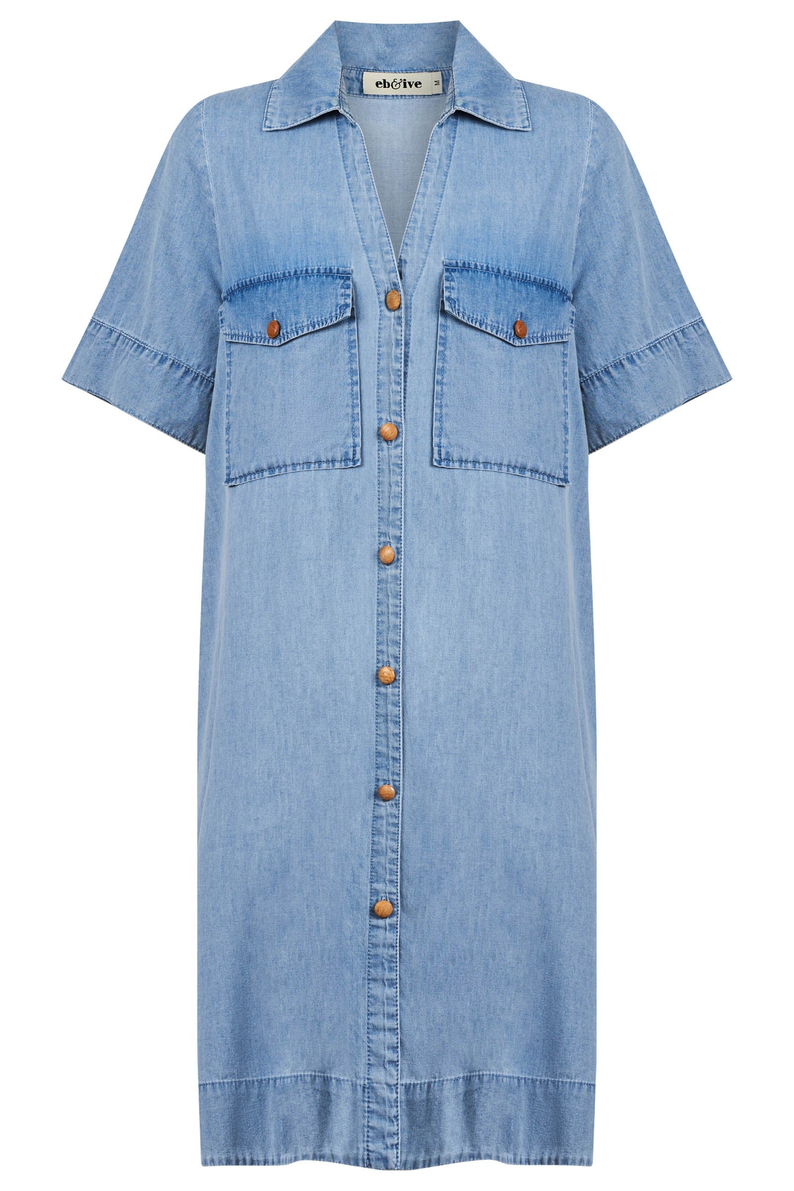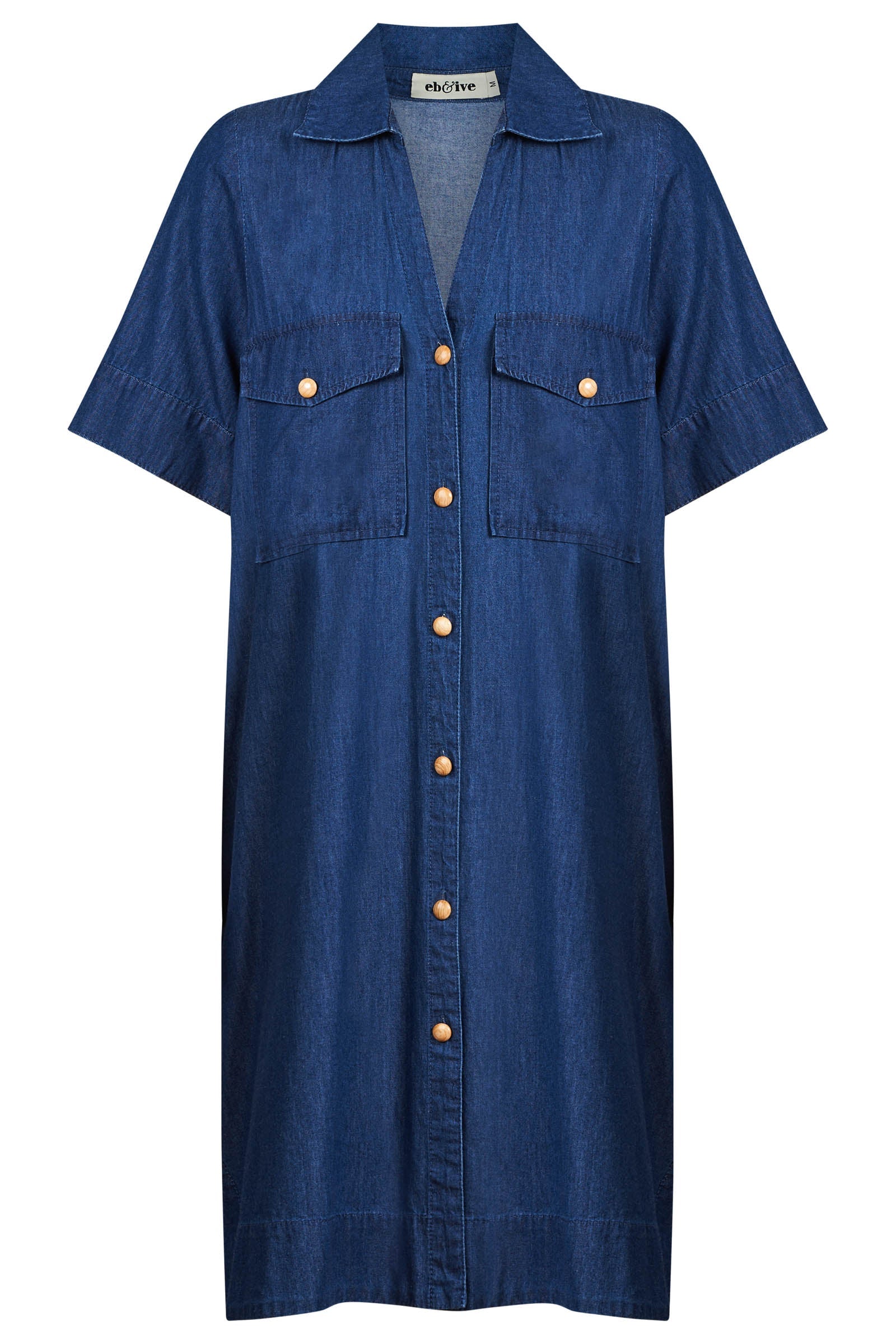 A beautifully soft and lightweight chambray shirt dress for everyday ease and elegance. Crafted from 100% cotton to create an effortless denim look. Features an open collar, wood button details, curved hem with stitched detail, small side splits, and functional front pockets.