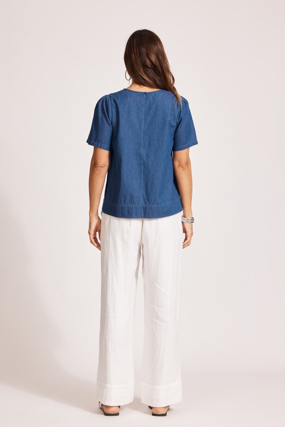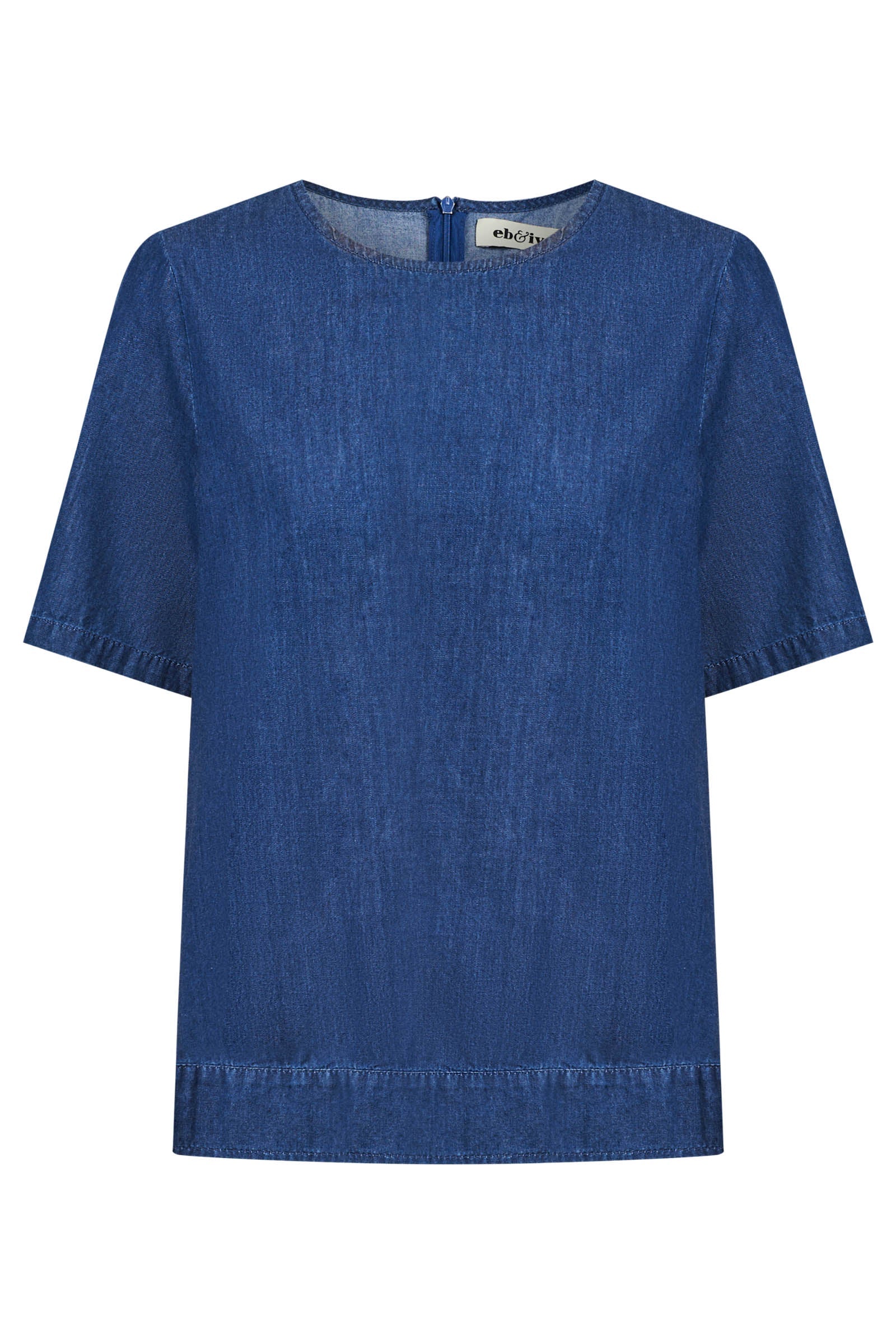 A beautifully soft and lightweight chambray top. Crafted from 100% cotton to have an effortless denim look. This is a t-shirt style silhouette with a wide hem detail and button closure at back of neck.