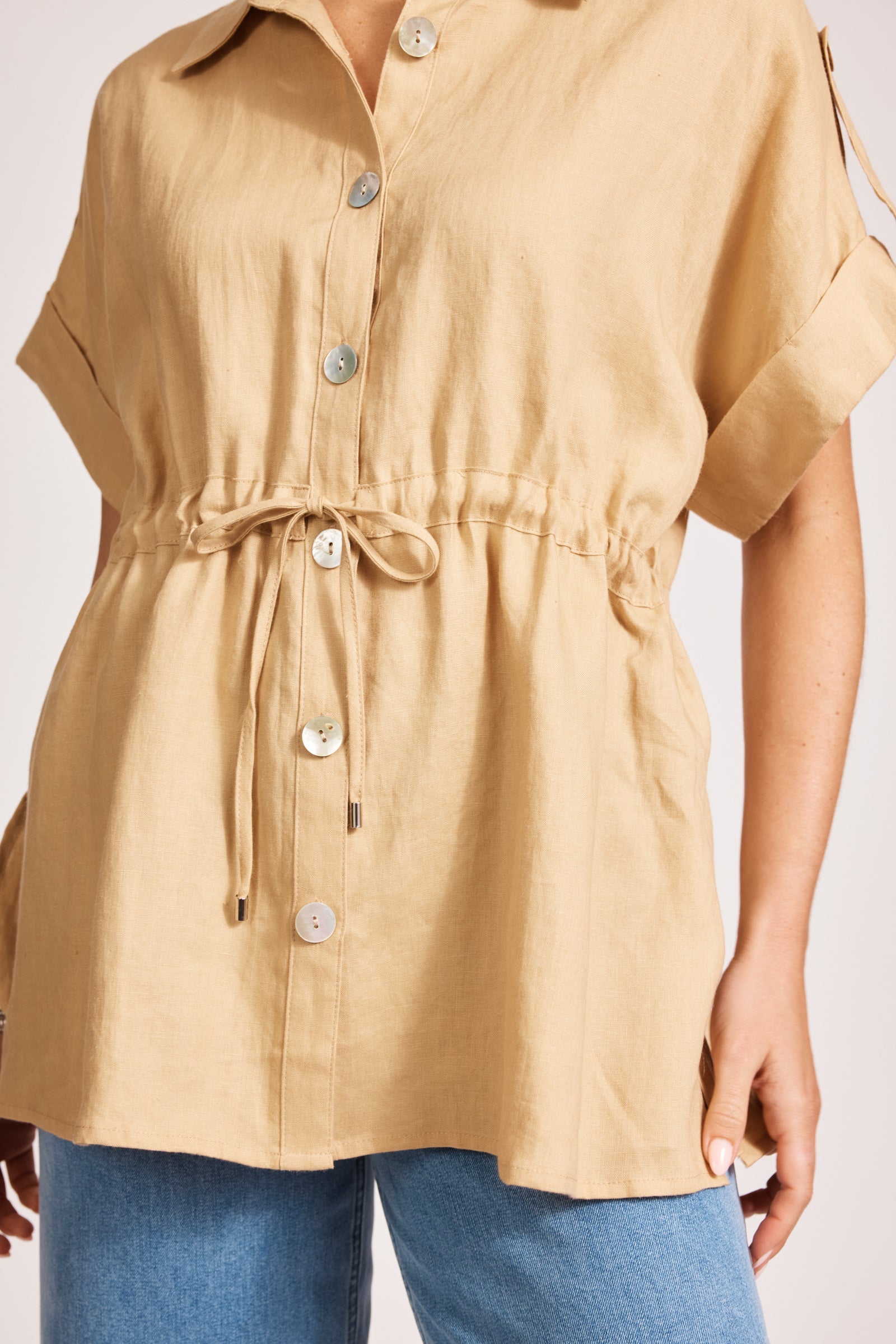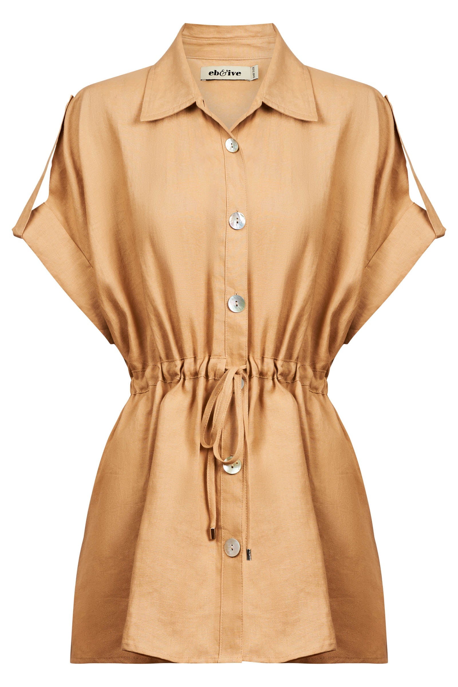 A modern update on a wardrobe classic. Crafted from 100% linen for airy comfort. Features a collared neckline, button-through front, drawstring waist, and side splits to flatter the silhouette. Finished with larger mother-of-pearl buttons and lapel detail at the shoulder.