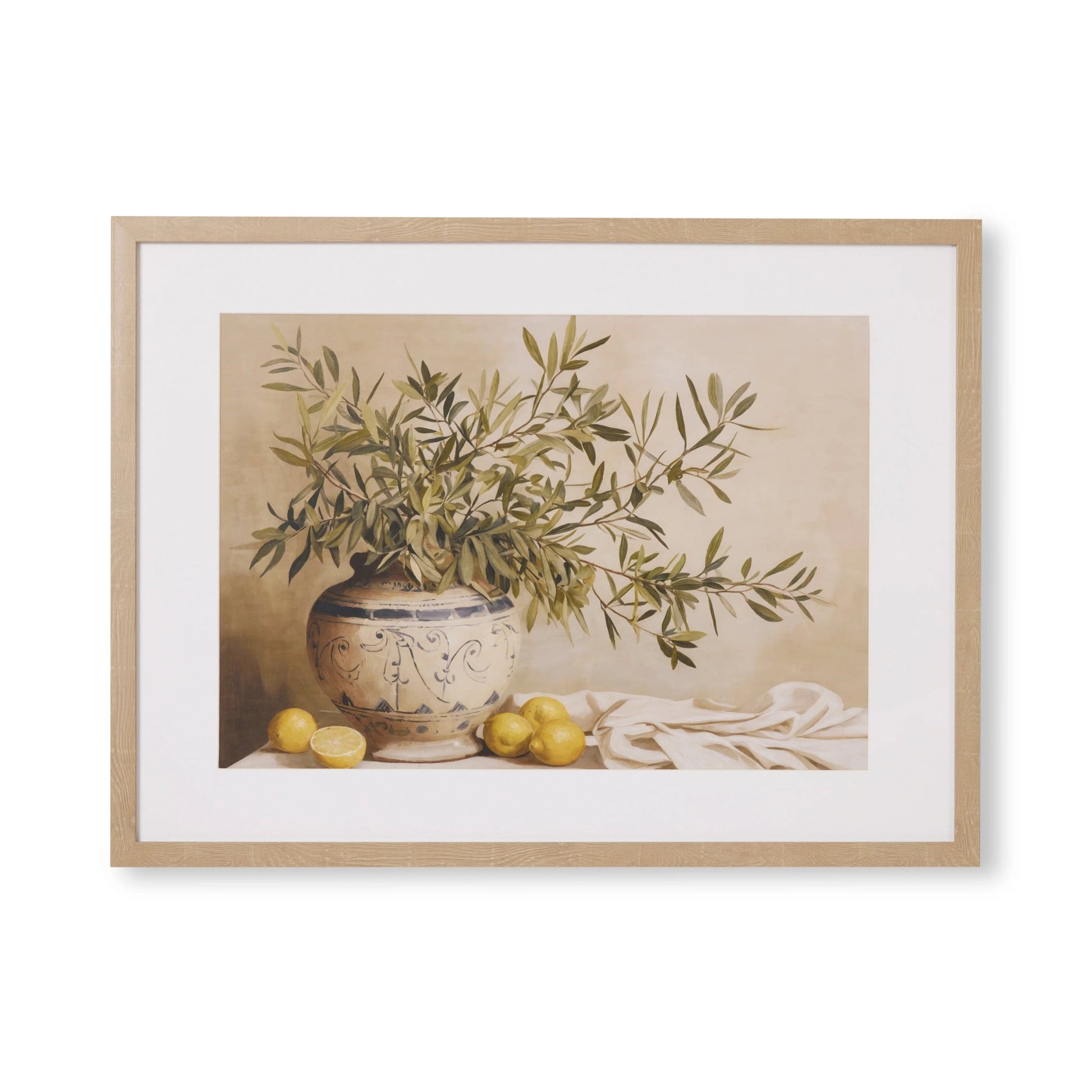 This framed artwork features a vase filled with olive branches and lemons, bringing a fresh and natural touch to your space. Its elegant design makes it a perfect statement piece for any room.
