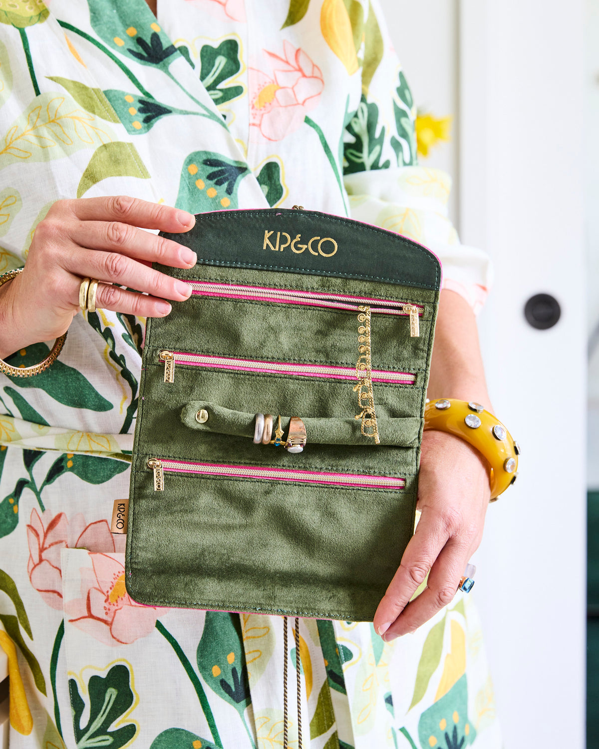 Streamlined, stylish, and full of personality! The Prickly Pear Velvet Jewellery Roll is perfect for keeping your rings, earrings, and favourite pieces tidy and secure. Three zipped compartments plus a soft strap with a press-stud for rings make it a playful yet practical companion - whether you’re zipping between brunch, beach, or the office. Draped in bright pink velvet with a khaki green interior, this roll is a little pocket of colour and charm for your everyday treasures.