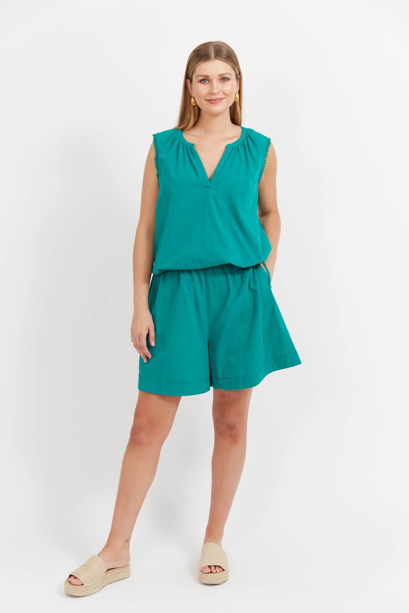 The Santos Top combines lightweight cotton with soft detailing for a flattering, feel-good fit. Featuring a gathered V-neckline, lace-trimmed shoulders and a relaxed silhouette. An adjustable drawstring hem lets you style it loose or cinched, depending on your day.