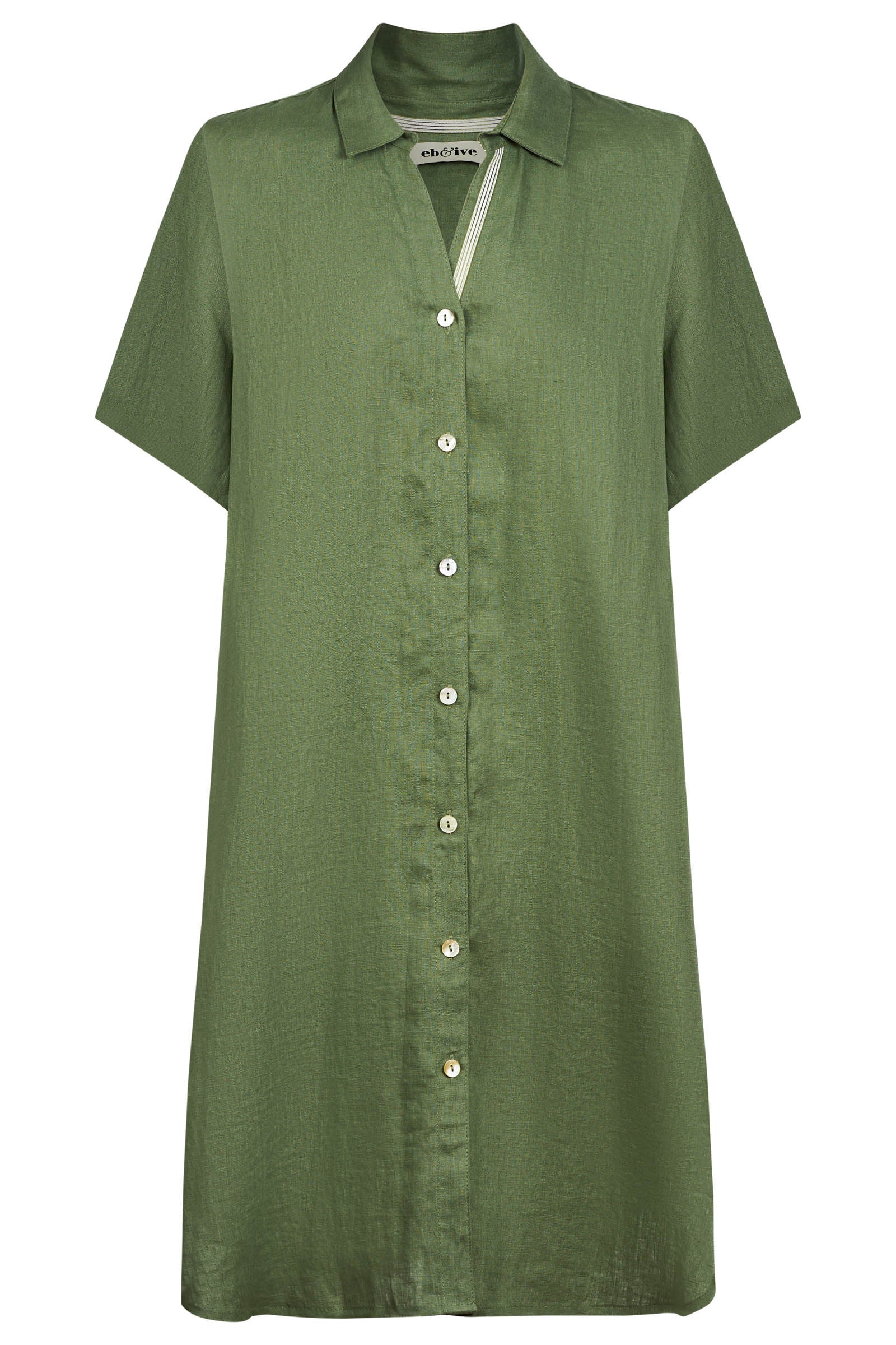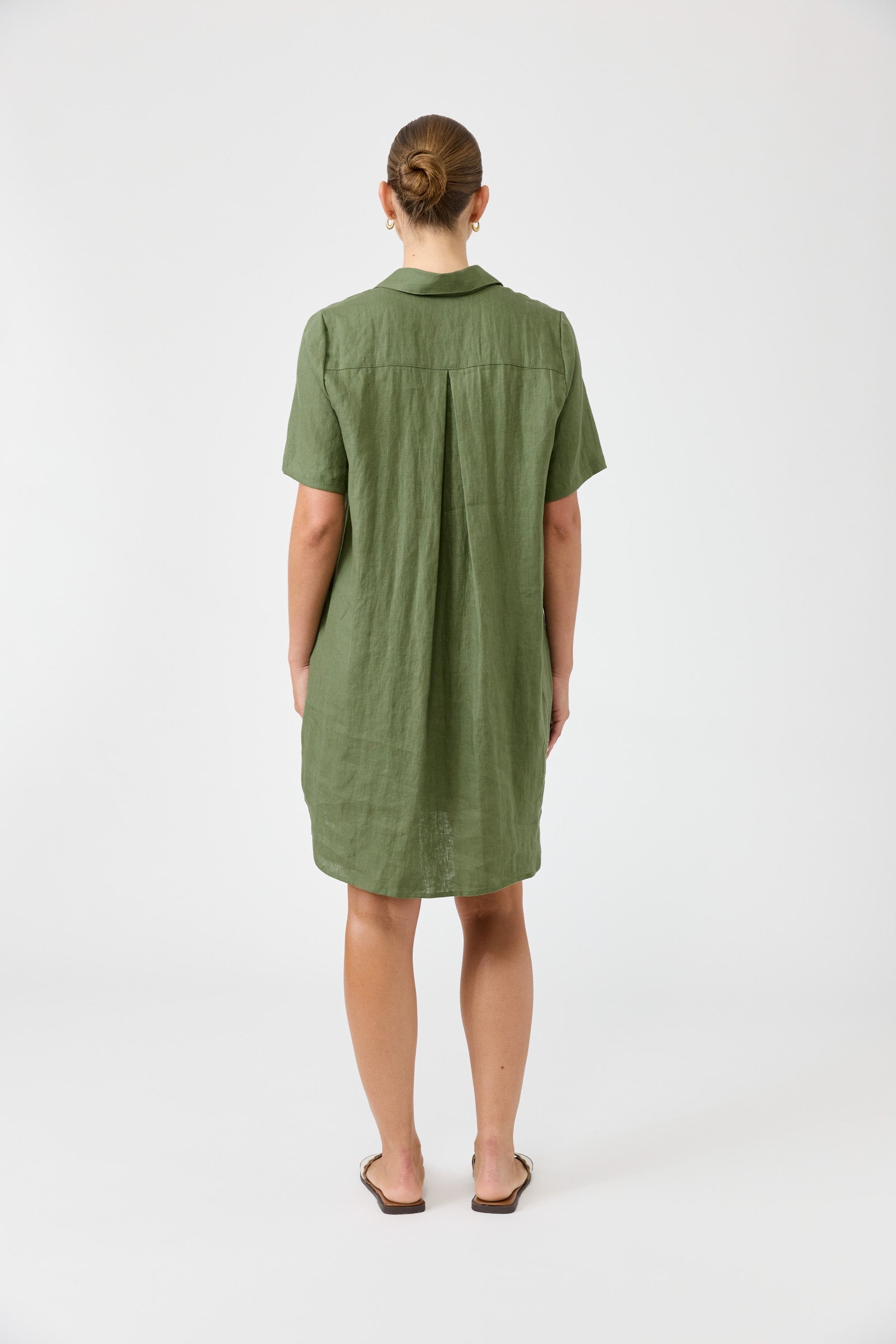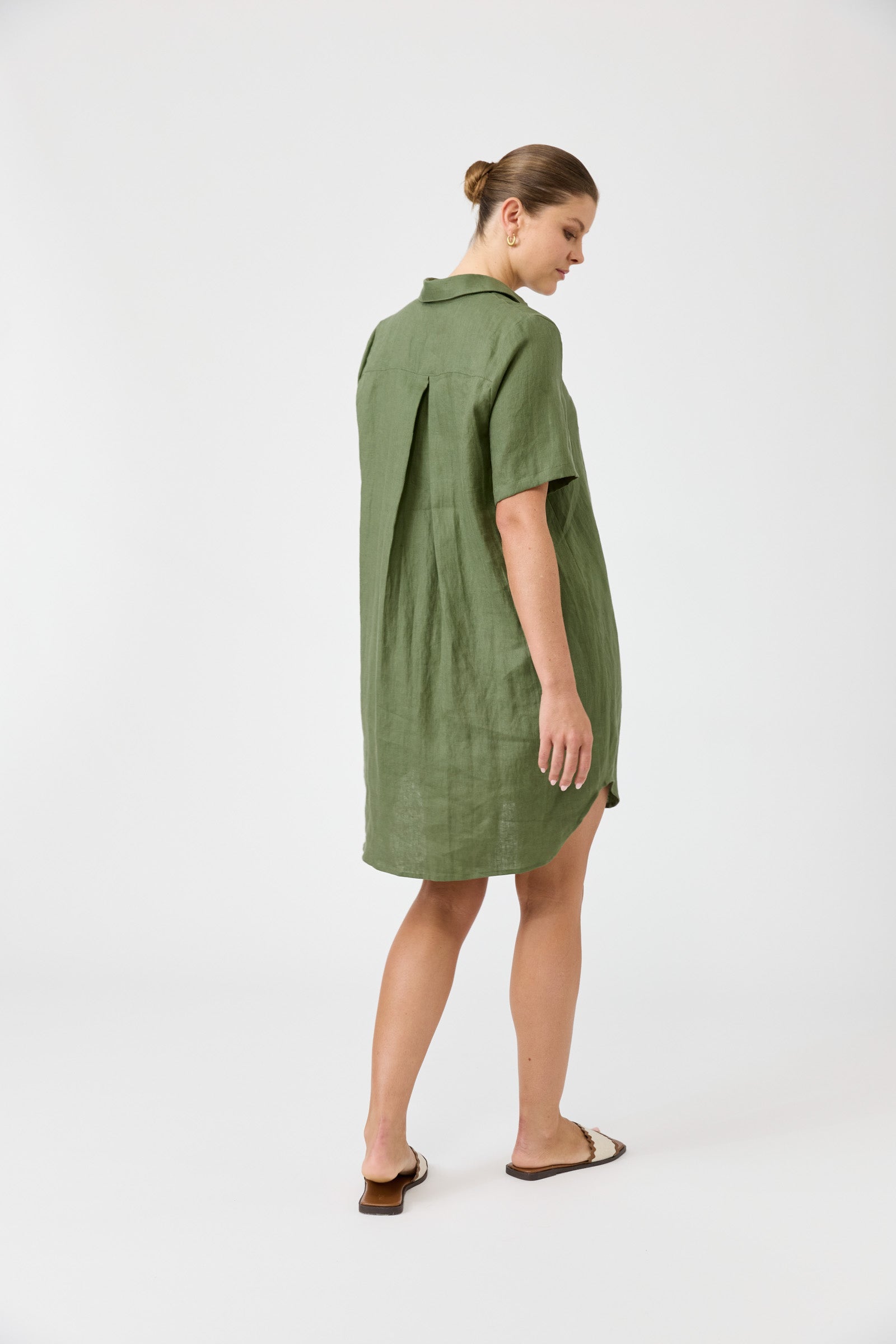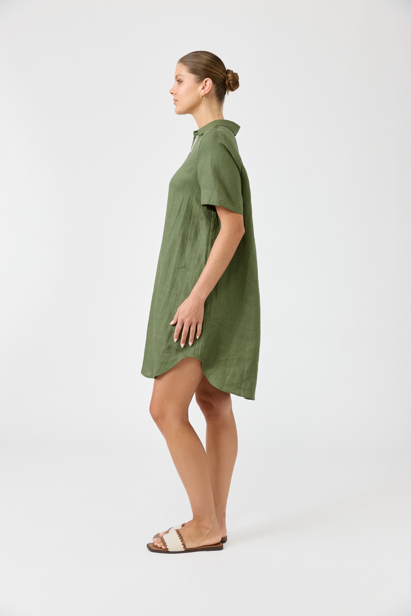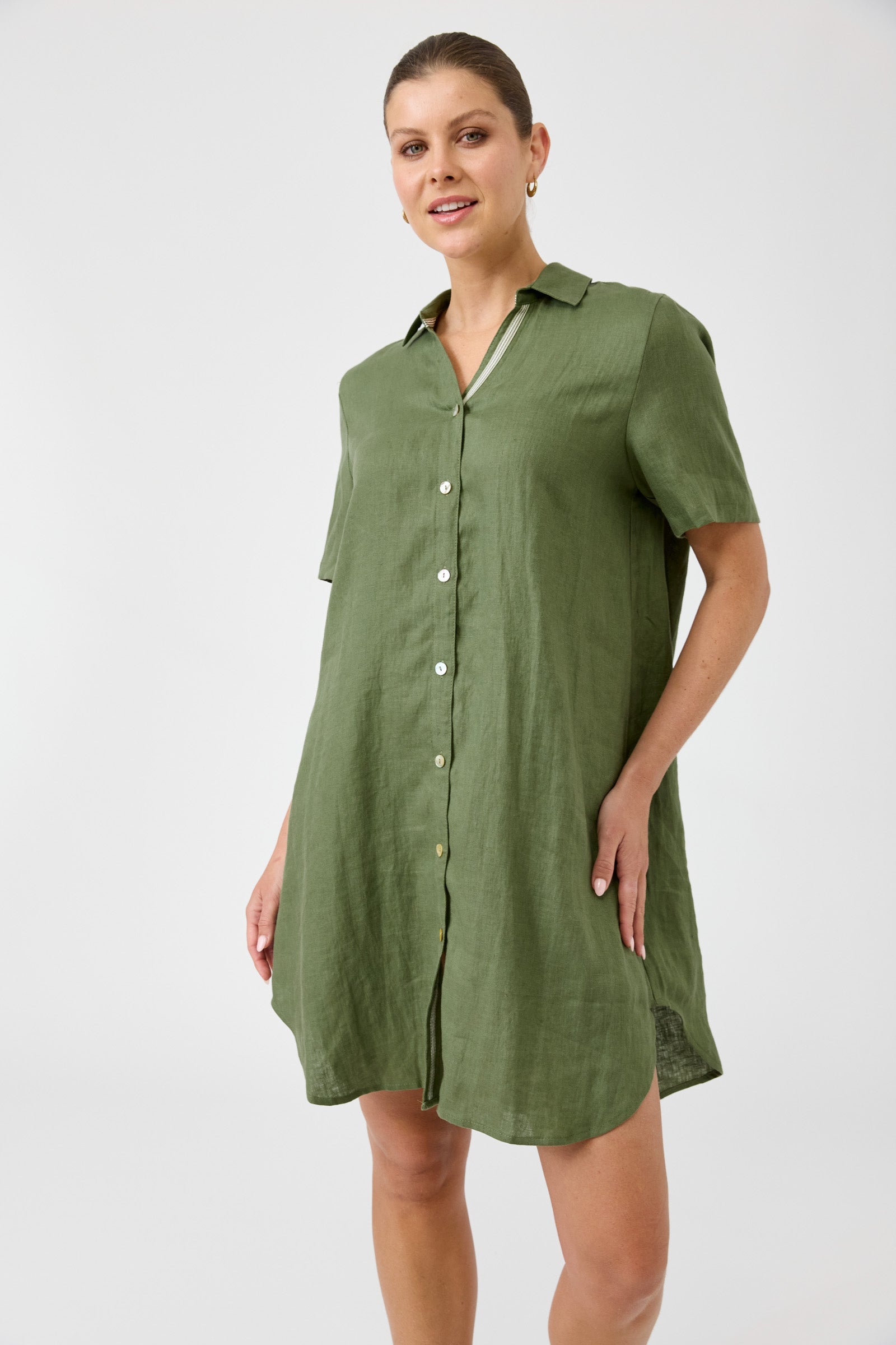 A versatile wardrobe staple designed for effortless, everyday style. Crafted from premium 100% linen for breathable comfort. Features a collared neckline, button-through front, and chic contrast trim at the inner collar. Short sleeves, a back pleat, and a curved high-low hem create a flattering, easy silhouette. Designed to fall to the knee with a regular fit.