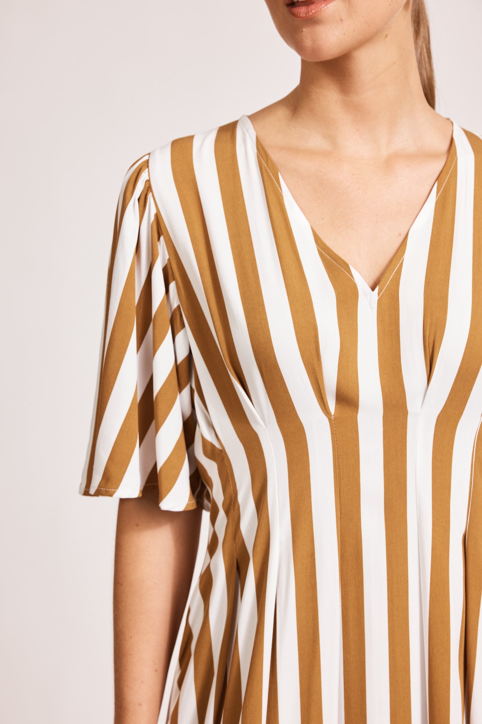 A statement striped maxi designed to flatter. Crafted from soft washed rayon for light, easy wear. Features contoured panelling at the waist, flared relaxed sleeves, A-line shape below the waist, and functional pockets.