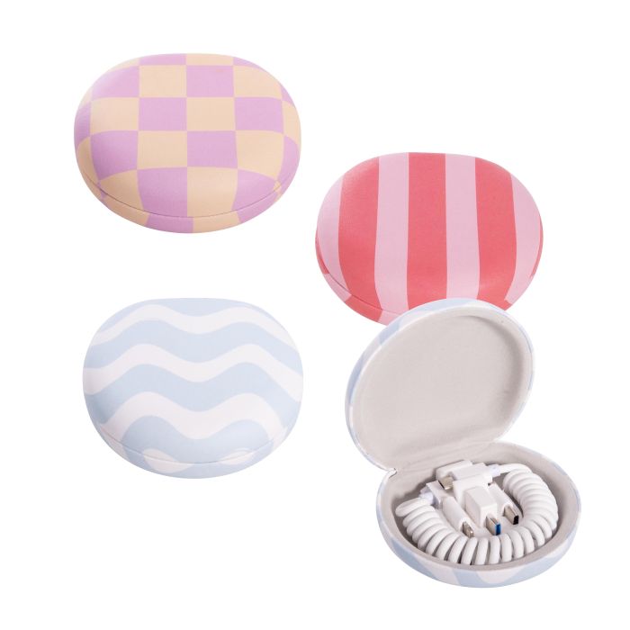 This portable storage case includes a micro USB, lightening and USB C plugs and cables.
