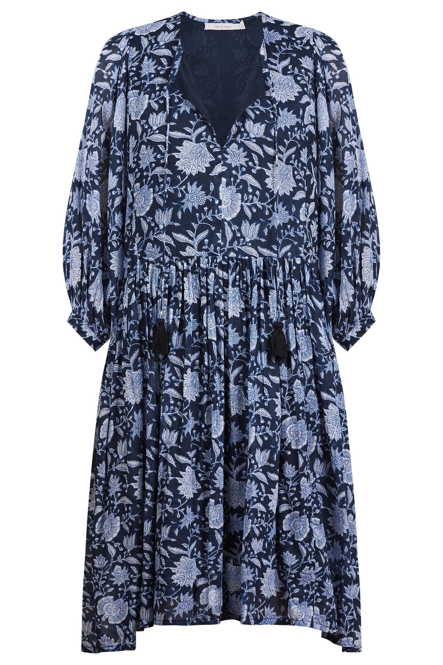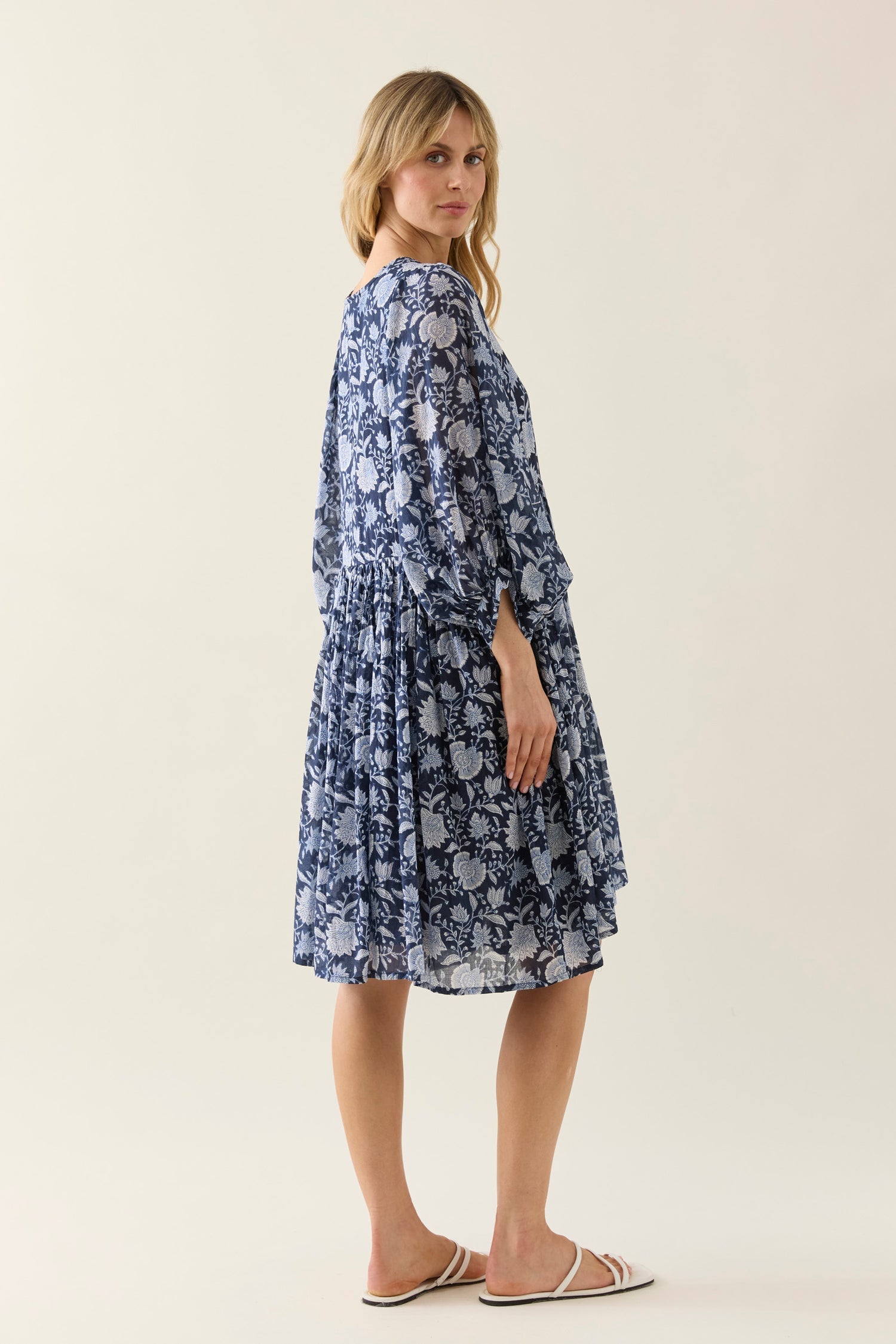 The Wilma Dress is crafted from lightweight cotton voile, hand screen printed for a one-of-a-kind look. Inspired by floral hand-block, and featuring a V-neckline with tassel ties, a gathered waist, 3/4 sleeves. Fully lined for comfort and ready to wear.